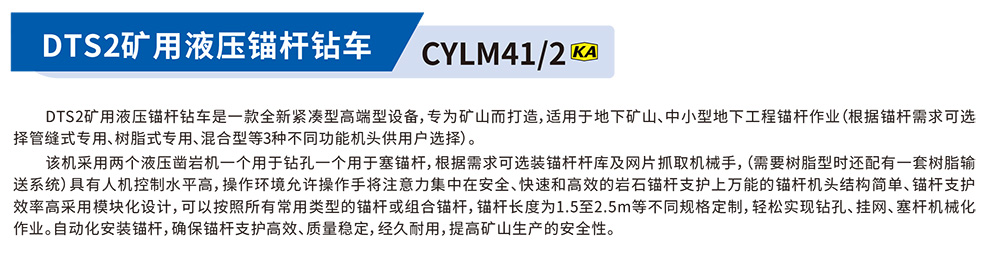 DTS2矿用液压锚杆钻车是一款全新紧凑型高端型设备,专为矿山而打造,适用于地下矿山、中小型地下工程锚杆作业(根据锚杆需求可选择管缝式专用、树脂式专用、混合型等3种不同功能机头供用户选择)。该机采用两个液压凿岩机一个用于钻孔一个用于塞锚杆,根据需求可选装锚杆杆库及网片抓取机械手,(需要树脂型时还配有一套树脂输送系统)具有人机控制水平高,操作环境允许操作手将注意力集中在安全、快速和高效的岩石锚杆支护上万能的锚杆机头结构简单、锚杆支护效率高采用模块化设计,可以按照所有常用类型的锚杆或组合锚杆,锚杆长度为1.5至2.5m等不同规格定制,轻松实现钻孔、挂网、塞杆机械化作业。自动化安装锚杆,确保锚杆支护高效、质量稳定,经久耐用,提高矿山生产的安全性。