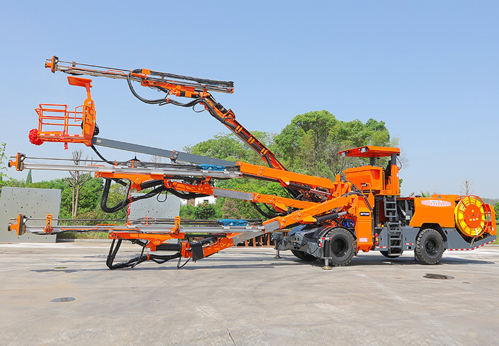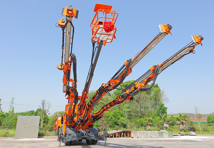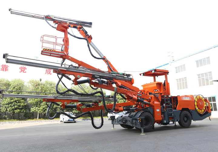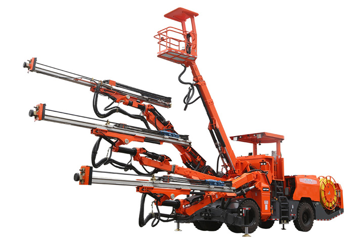 DW3-180三臂(液压)凿岩台车是一款三臂凿岩设备,采用三套钻臂为独立液压系统控制,钻臂可伸缩覆盖面积广,设有一套高空服务吊篮可为装药、排险、挂网等辅助工作提供升降平台。为高速高铁、水利水电工程、以及国防等中大型隧道掘进钻孔作业而研发制造的凿岩装备,满足凿岩掘进需要的各种炮孔、锚杆孔、小导管支护、注浆孔等;该机工作时采用全液压驱动,电液比例阀控系统控制钻臂凿岩,动作柔顺定位迅速、凿岩速度快,全实时液压平动式钻臂使推进梁全方位可保持平行,设有自动防卡钎、凿岩完毕停止冲击、退杆等功能;柴油机供行走,四轮四驱、动力强劲、转场灵活,整机结构布置紧凑、重心低、机动灵活、系统稳定,不仅提升安全保障和工作效率,也能降低劳动者的工作强度。电脑自动化控制系统高度精度的掌控钻臂按预先设计好布孔图有序一键完成自动钻孔,可精确自动控制钻孔孔位、推进梁角度和孔深,同时显示器精确显示实时钻孔情况。