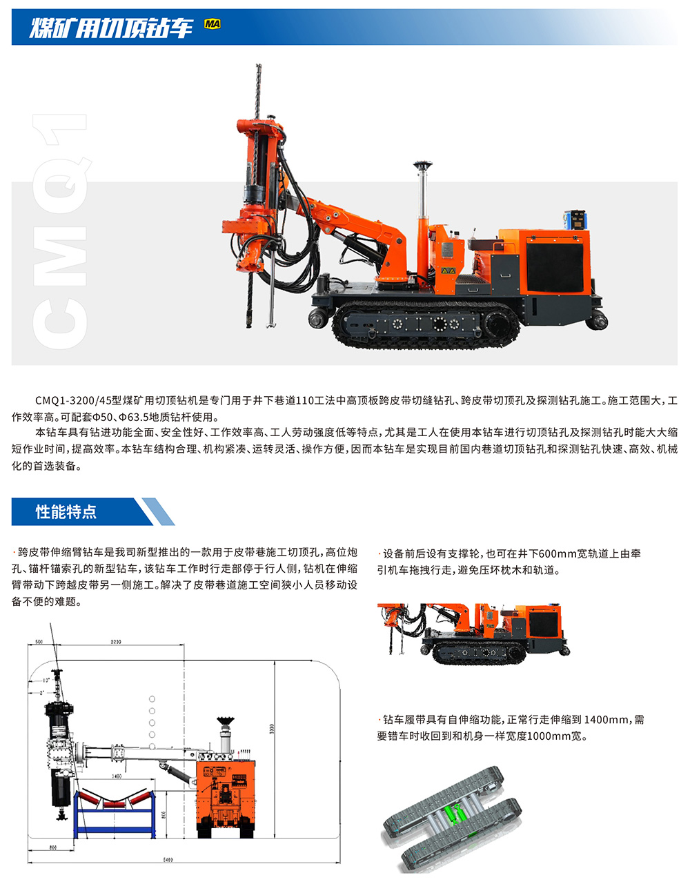 CMQ1-3200/45型煤矿用切顶钻机是专门用于井下巷道110工法中高顶板跨皮带切缝钻孔、跨皮带切顶孔及探测钻孔施工。施工范围大,工作效率高。可配套中50、中63.5地质钻杆使用。本钻车具有钻进功能全面、安全性好、工作效率高、工人劳动强度低等特点,尤其是工人在使用本钻车进行切顶钻孔及探测钻孔时能大大缩短作业时间,提高效率。本钻车结构合理、机构紧凑、运转灵活、操作