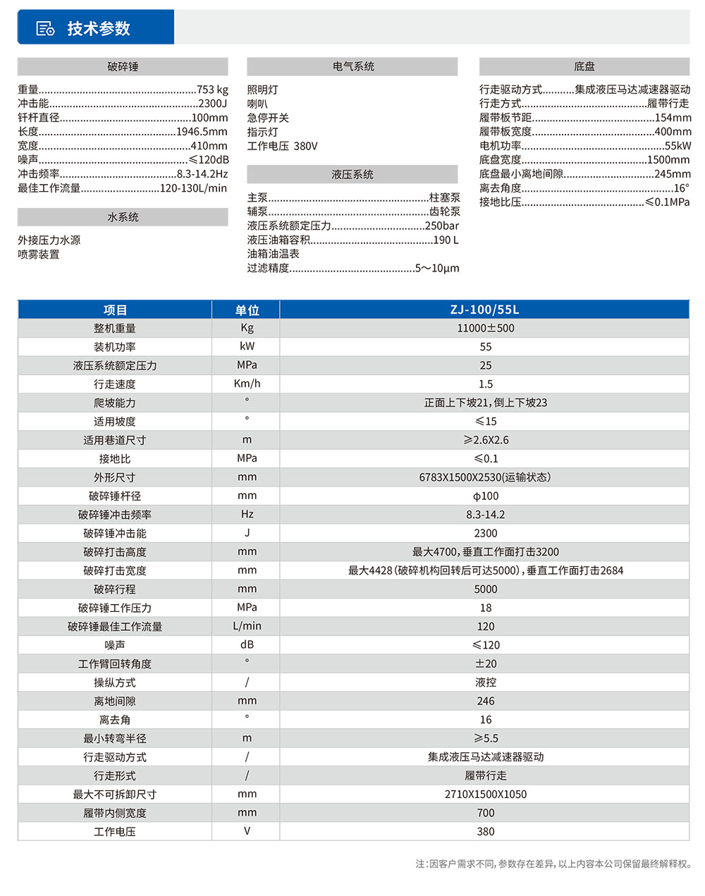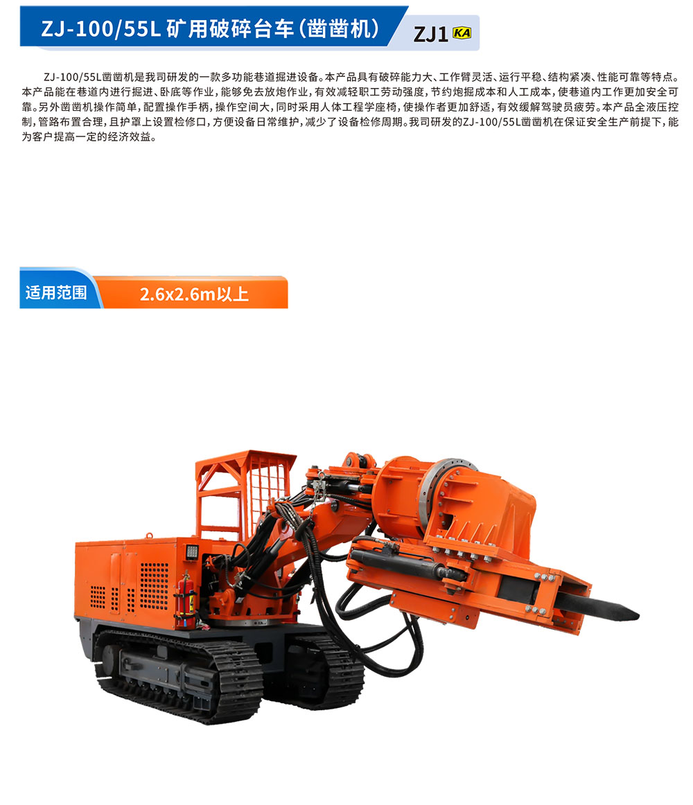 ZJ-100/55L凿凿机是我司研发的⼀款多功能巷道掘进设备。本产品具有破碎能⼒⼤、⼯作臂灵活、运⾏平稳、结构紧凑、性能可靠等特点。本产品能在巷道内进⾏掘进、卧底等作业,能够免去放炮作业,有效减轻职⼯劳动强度,节约炮掘成本和⼈⼯成本,使巷道内⼯作更加安全可靠。另外凿凿机操作简单,配置操作⼿柄,操作空间⼤,同时采⽤⼈体⼯程学座椅,使操作者更加舒适,有效缓解驾驶员疲劳。本产品全液压控制,管路布置合理,且护罩上设置检修⼝,⽅便设备⽇常维护,减少了设备检修周期。我司研发的ZJ-100/55L凿凿机在保证安全⽣产前提下,能为客⼾提⾼⼀定的经济效益。