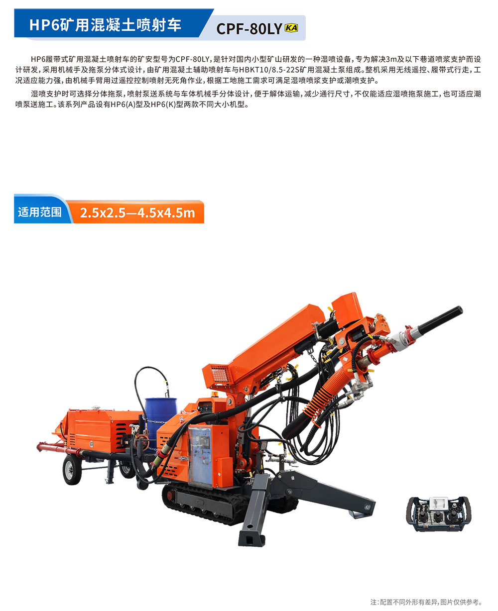 HP6履带式矿⽤混凝⼟喷射⻋的矿安型号为CPF-80LY,是针对国内⼩型矿⼭研发的⼀种湿喷设备,专为解决3m及以下巷道喷浆⽀护⽽设计研发,采⽤机械⼿及拖泵分体式设计,由矿⽤混凝⼟辅助喷射⻋与HBKT10/8.5-22S矿⽤混凝⼟泵组成。整机采⽤⽆线遥控、履带式⾏⾛,⼯况适应能⼒强,由机械⼿臂⽤过遥控控制喷射⽆死⻆作业,根据⼯地施⼯需求可满⾜湿喷喷浆⽀护或潮喷⽀护。湿喷⽀护时可选择分体拖泵,喷射泵送系统与⻋体机械⼿分体设计,便于解体运输,减少通⾏尺⼨,不仅能适应湿喷拖泵施⼯,也可适应潮喷泵送施⼯。该系列产品设有HP6(A)型及HP6(K)型两款不同⼤⼩机型。