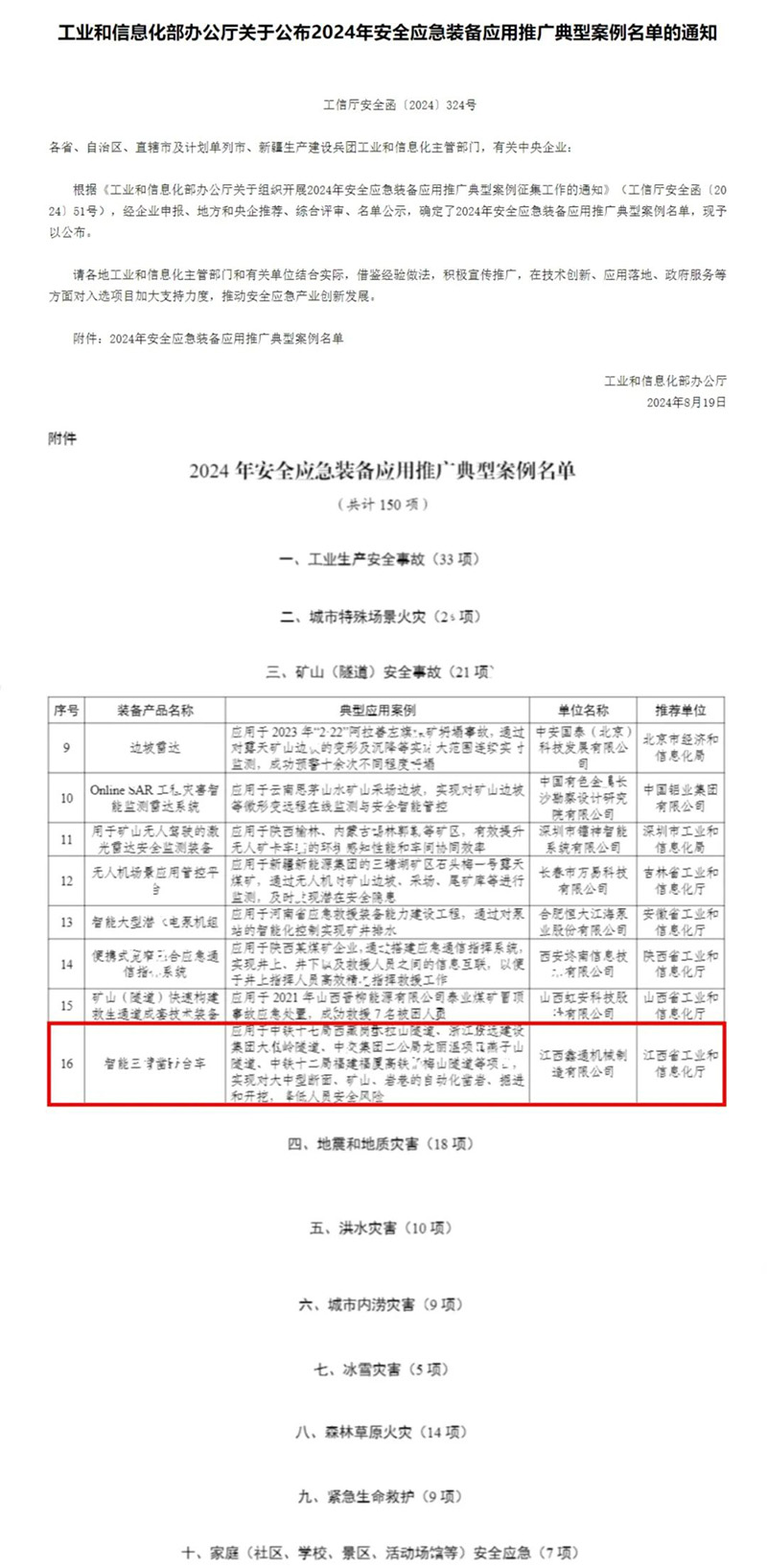 近日,国家工业和信息化部办公厅公布了《2024年安全应急装备应用推广典型案例》名单,江西澳门金沙赌场智能三臂凿岩台车(DW3-180E)成功入选,成为全省唯一入选“矿山(隧道)安全事故”板块的典型案例。