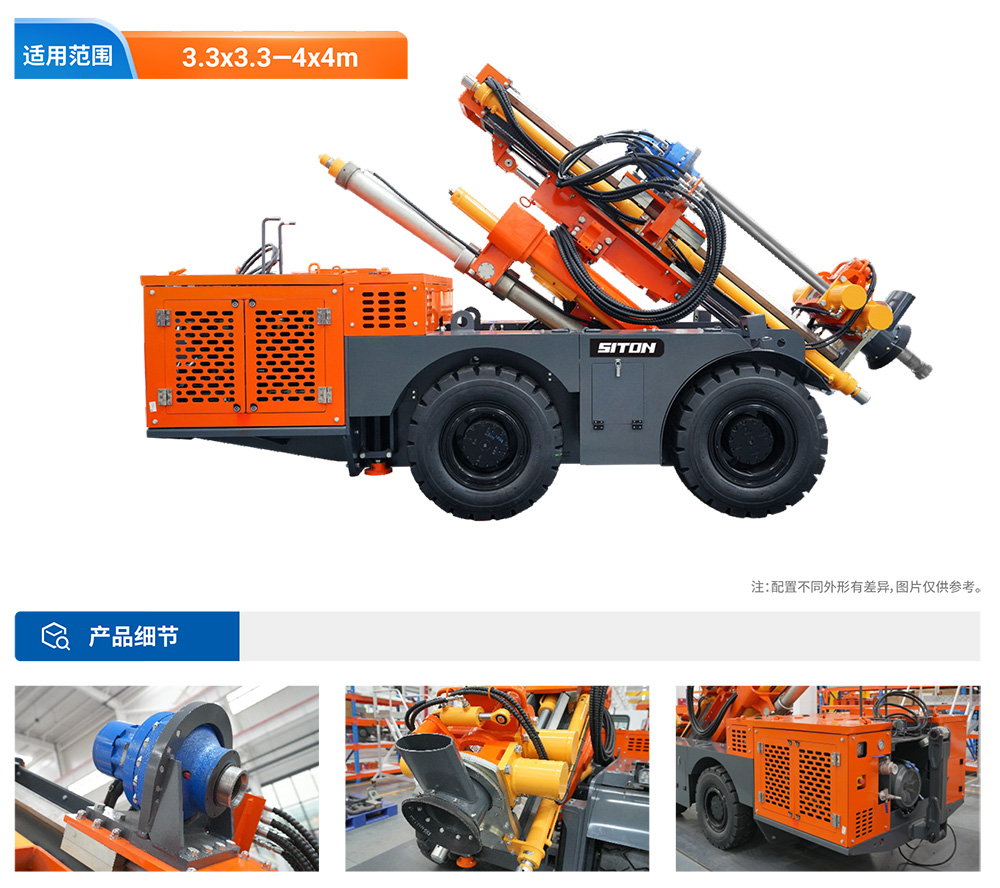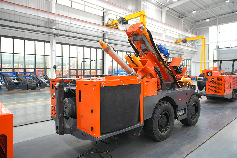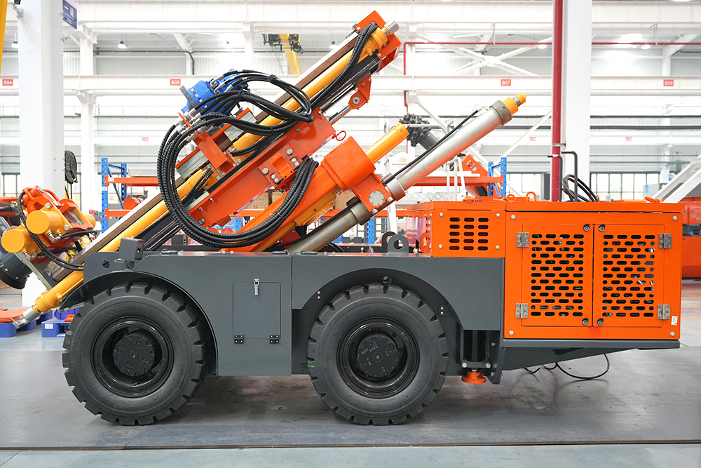 KODT-125是一款轮胎式矿用潜孔钻机,电压等级:380V,采用潜孔冲击器作业,闭式四驱液压系统,适用于3.3-4m地下采场环形孔的穿凿,是专用的穿孔设备,也可用于天井和斜井的开凿及回采作业。主要功能和装置如下:适用于钻孔直径范围120-254mm,钻孔深度0-100m;钻架可环向360°旋转,前后-10°-55°度摆动,适用于环向打孔;钻臂装载有液压稳杆机构,保证钻孔直度,偏斜率≤1%;机身配有顶升支腿和后摆动桥,可在路面坑洼恶劣条件下工作;设备四驱驱动,可实现360°转弯,原地掉头;长距离移动时,设备可解锁制动,且配备牵引,方便使用拖车进行快速移动;钻机回转具有无级调速功能,可根据不同岩层状况调整钻速,提高效率;且设备配置遥控装置,方便操作人员操作设备的同时,提高了操作安全性和可靠性;设备配备了冲洗装置,方便操作人员清理设备,维持设备整洁,提高设备使用寿命。